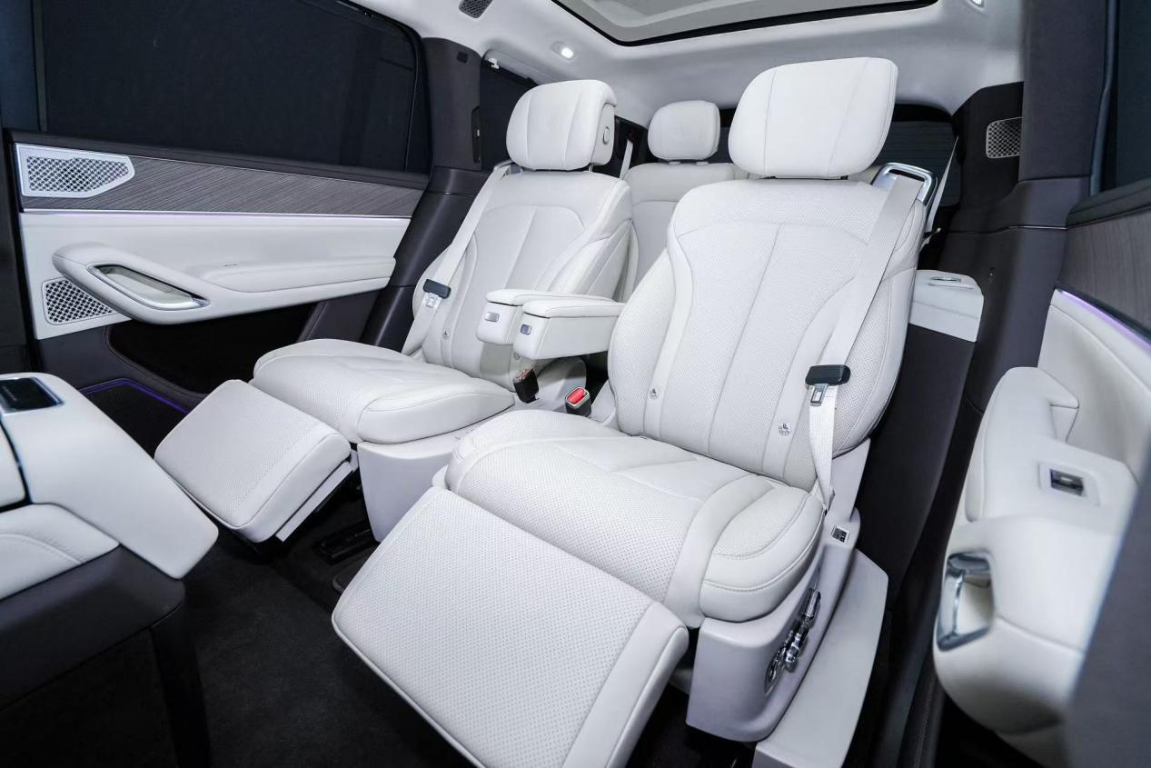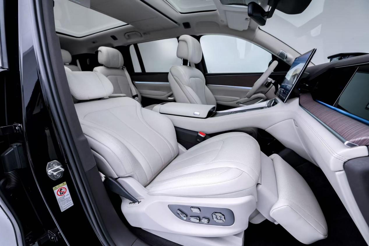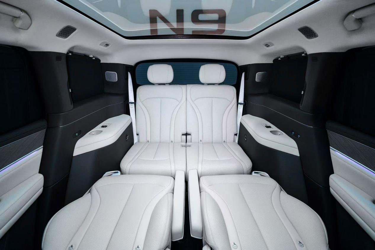 騰勢N9第二排配置了 2 個(gè)獨(dú)立座椅,除了14向電動(dòng)調(diào)節(jié)、電動(dòng)雙腿托(4 向調(diào)節(jié))、雙桌板、雙 50W 無線充電之外,還可以進(jìn)行左右橫移聯(lián)動(dòng)調(diào)節(jié),這樣一來中間過道可以更寬,進(jìn)出第三排就會(huì)更方便。