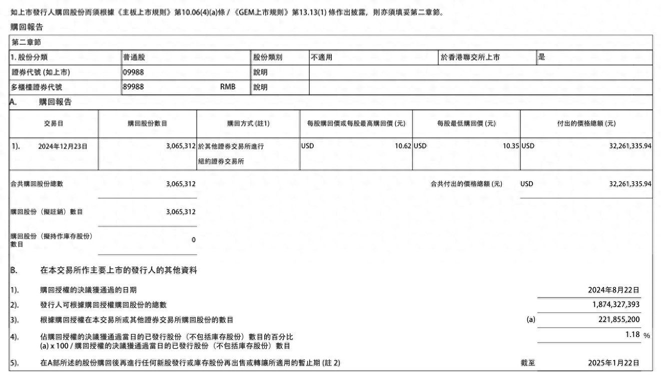 12月24日消息,阿里巴巴公告,公司于12月23日回購股份306.53萬股,每股回購價格為10.35-10.62美元,耗資3226.13萬美元。