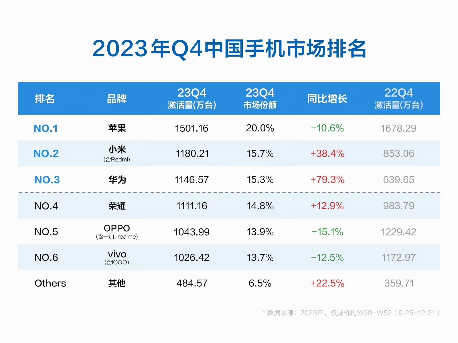 排名第二的是小米,它的激活量為1243.22萬臺,市場份額為17.14%,同比增長5.3%。和去年相比,小米和第一名的差距大幅縮小,從320.95萬臺縮小至65.56萬臺。作為橫向?qū)Ρ龋?022年Q4小米激活量僅為853.06萬臺,2023年Q4小米激活量為1180.21萬臺。和華為有所不同,小米激活量主力軍是小米15系列和紅米K80系列,所以在高端市場小米還需要繼續(xù)努力。