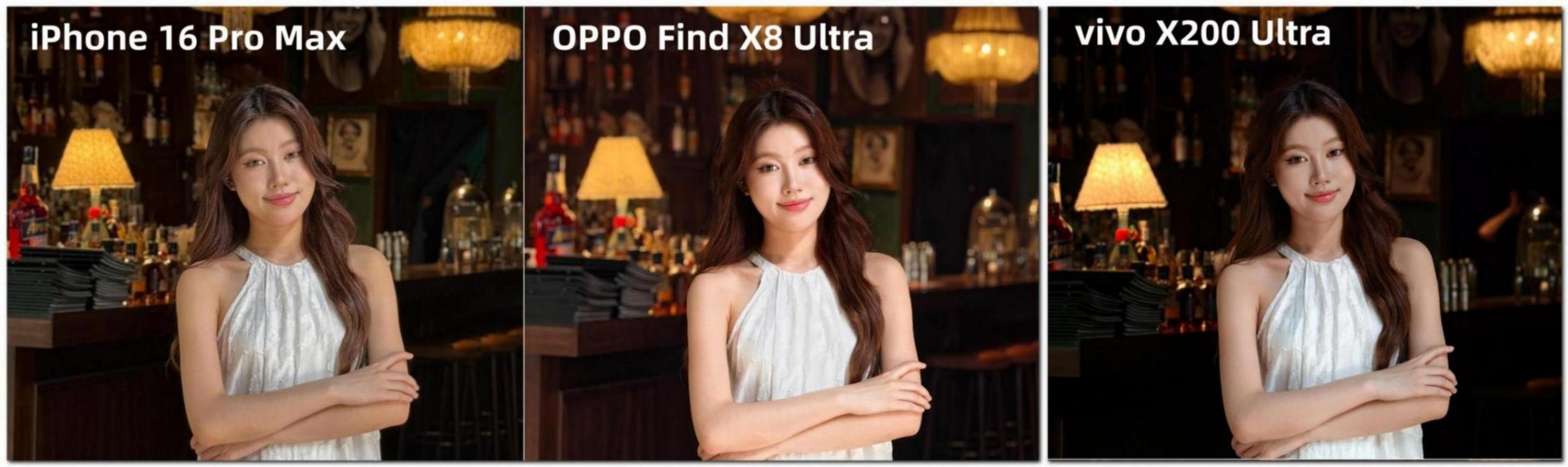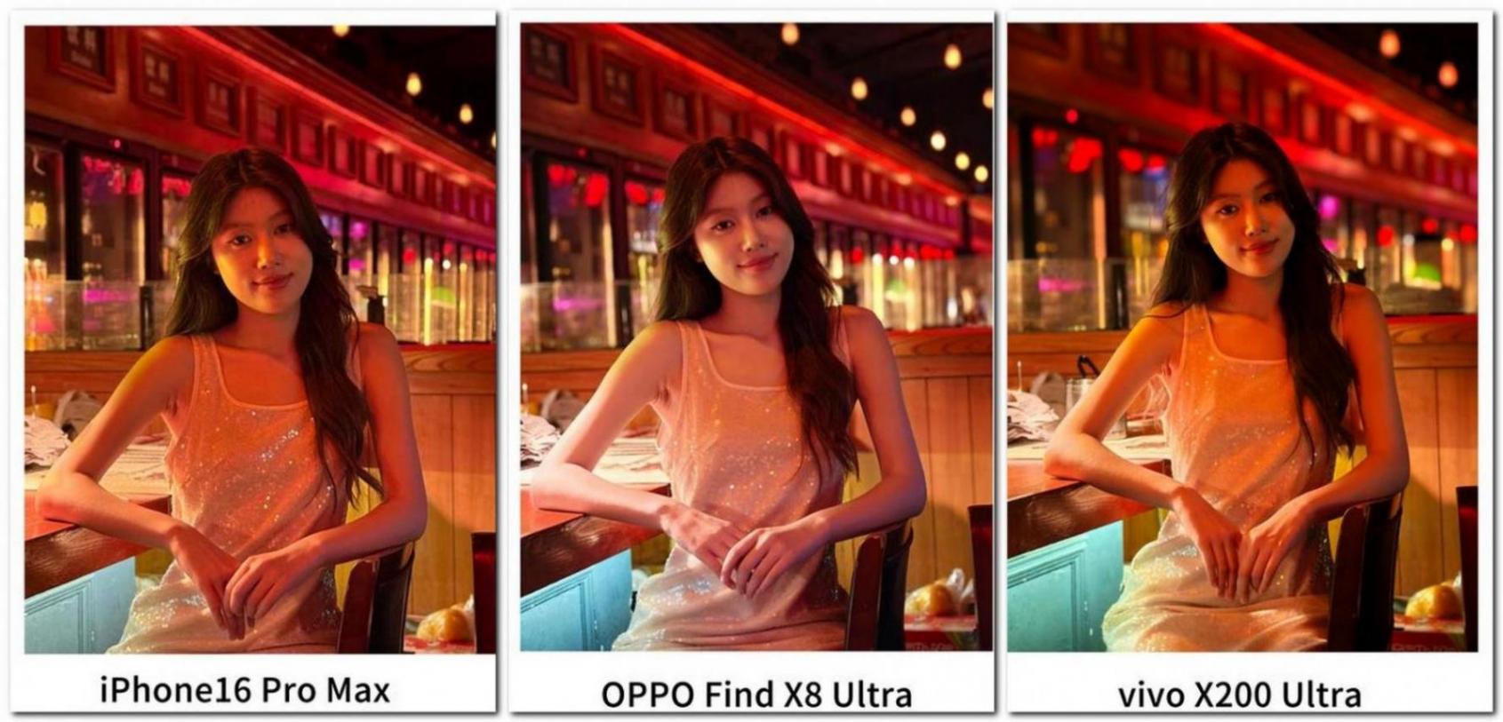 另一組對(duì)比中也足以看出,iPhone 16 Pro Max拍攝的人臉暗沉模糊,vivo X200 Ultra人臉明亮清晰,OPPO Find X8 Ultra對(duì)于色彩和層次的解析更加準(zhǔn)確,人臉更有氣血感。