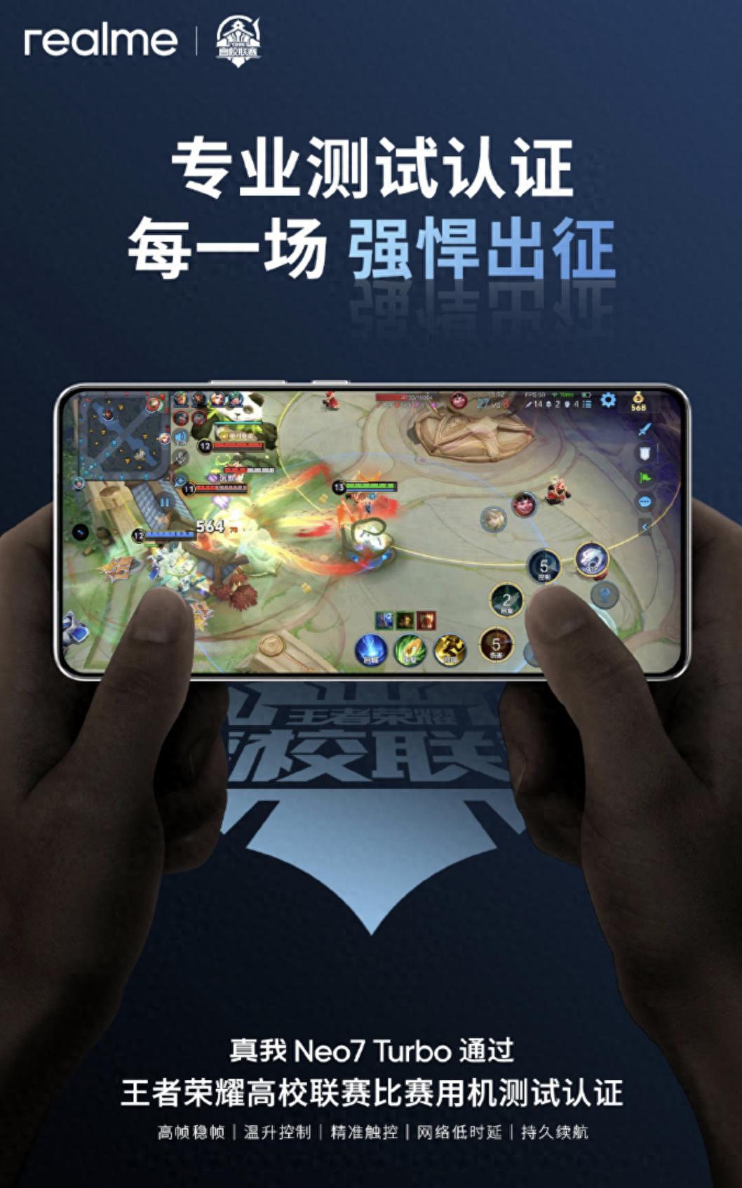 5 月 23 日消息,真我手機官方微博今天對即將在 5 月 29 日發布的 realme 真我 Neo7 Turbo 手機進行預熱,強調該機電競方面表現,通過《王者榮耀》高校聯賽比賽用機測試認證。