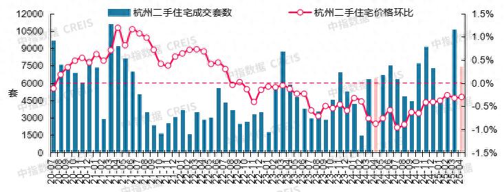 圖:2020年7月至2025年4月杭州二手住宅成交套數及二手住宅價格環比走勢