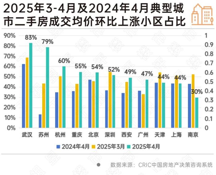 具體到城市來看,2025年4月,武漢二手房成交均價環比上漲小區占比最高,達83%,其次為蘇州,達79%,杭州以60%排第三,杭州已連續兩個月有過半小區房價環比上漲,深圳亦是如此。