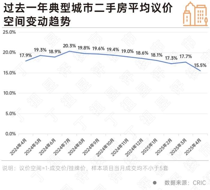 2025年4月,典型城市二手房平均議價空間為15.5%,環比下降2.2個百分點,創2024年以來新低。