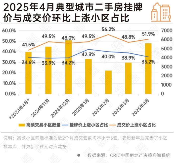 CRIC數據顯示,2025年4月重點監測城市樣本小區二手房房價上漲占比達到51.9%,自2025年2月后再度超過半數。議價空間進一步收窄,高端小區房價延續領漲。隨著掛牌價與成交價差距的持續收縮,二手房正在釋放出更多企穩新信號。