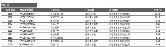 指數成份股方面,恒生指數官網數據顯示,該指數權重高配小米集團-W、阿里巴巴-W、騰訊控股,合計占比超30%。