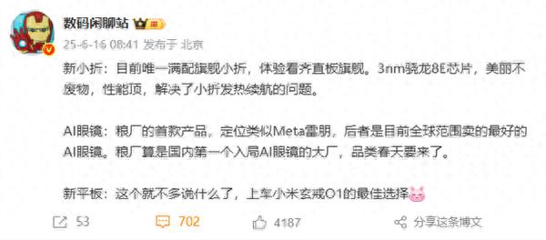 據(jù)知名數(shù)碼博主@數(shù)碼閑聊站 最新發(fā)布的信息顯示,有一款新機(jī)是目前唯一滿配旗艦小折,體驗看齊直板旗艦,搭載3nm驍龍8至尊版芯片,并且解決了小折疊發(fā)熱、續(xù)航的問題,將是行業(yè)罕見的滿血性能小折疊,針對游戲等需求也能應(yīng)對自如。結(jié)合此前相關(guān)爆料,該機(jī)大概率指的就是已經(jīng)得到不少曝光的全新小米MIX Flip 2。不僅如此,在強(qiáng)悍的性能下,該機(jī)依舊輕薄,整機(jī)展開態(tài)厚度是7.6mm,重量約為190g。