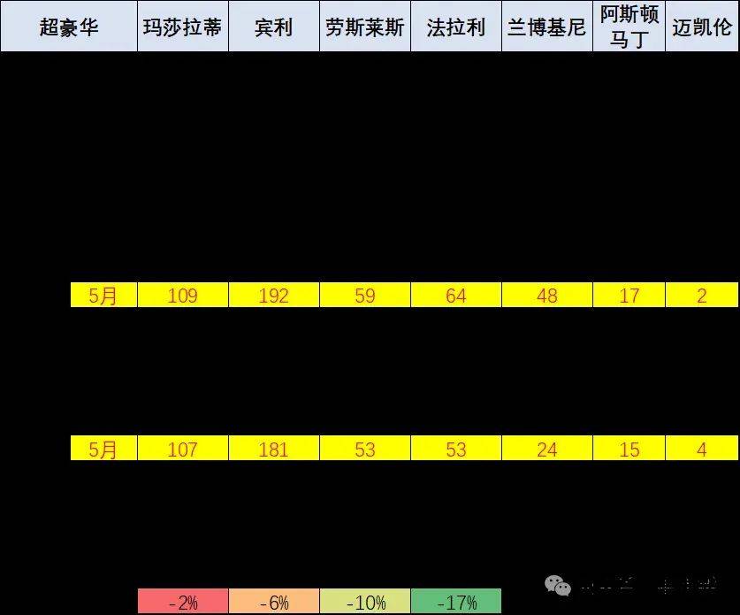 根據(jù)乘聯(lián)分會秘書長崔東樹在其個人微信公眾號披露的數(shù)據(jù),今年前5個月,賓利在華銷量為884輛,同比減少20%;勞斯萊斯在華銷量為289輛,同比減少23%;法拉利在華銷量為300輛,同比減少14%;蘭博基尼在華銷量為157輛,同比減少39%。
