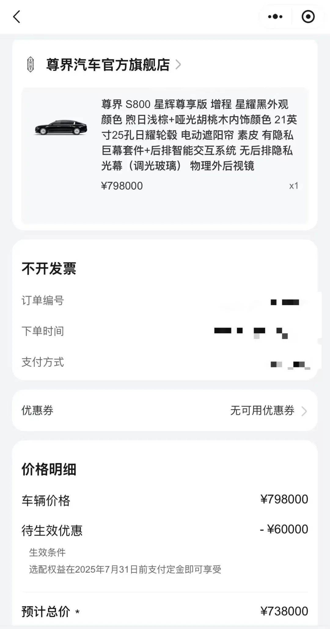 甚至,當前不少消費者已經(jīng)養(yǎng)成了“不試駕,先下單”的消費習慣。以來自廣州的尊界S800準車主王宇(化名)為例,去年11月下旬,尊界S800剛剛開啟預(yù)售的時候,王宇第一時間下單了星輝尊享版車型,又在今年5月30日之前轉(zhuǎn)小訂,因為這樣車價可以優(yōu)惠3萬元。