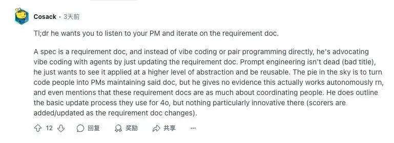 一位網友犀利地評論:這套思路本質上就是“多聽產品經理的話”,通過寫更好的規范文檔來驅動開發流程,并且從 Grove 的描述來看這種模式其實是把工程師變成“維護需求文檔的產品經理”。