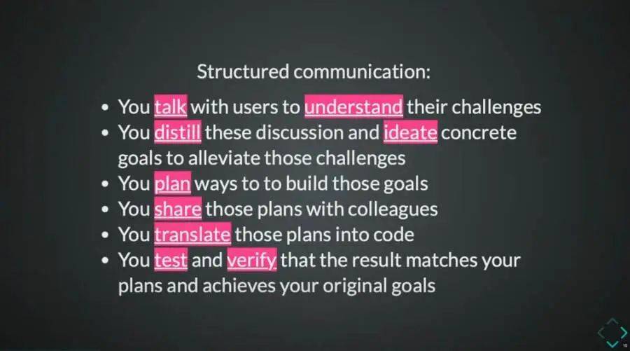 我們關注的是代碼對真實世界的影響,所以溝通、理解、提煉、構思、規劃、分享、翻譯、測試和驗證都是工作的重要環節。這些就是我說的結構化溝通,也是工作中最大的瓶頸所在。明確要構建什么、與他人溝通并收集需求,知曉如何構建、為什么構建,最終還要判斷構建是否正確、是否實現了最初的目標。