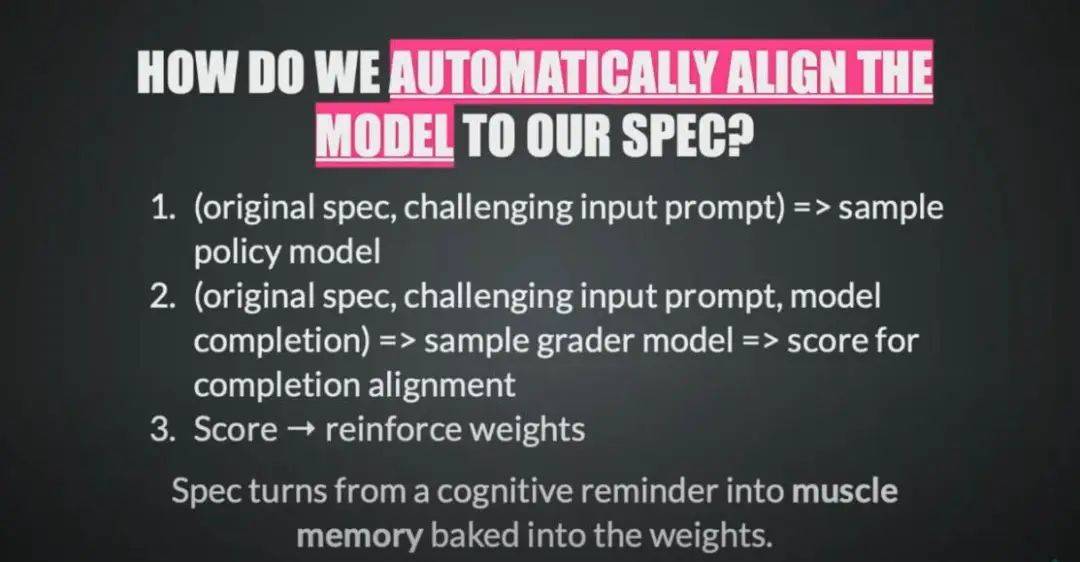 之后將獲得的響應、原始提示詞和策略輸入另一個更強大的模型,要求它根據規范對響應進行評分,包括對齊度如何等。如此一來,規范文檔就既充當訓練材料、也充當評估材料。根據得分,我們會強化具體權重,例如在上下文中引入規范,并在每次采樣時添加系統消息或開發者消息。雖然會占用一定算力,但卻能有效提高模型的輸出一致性。