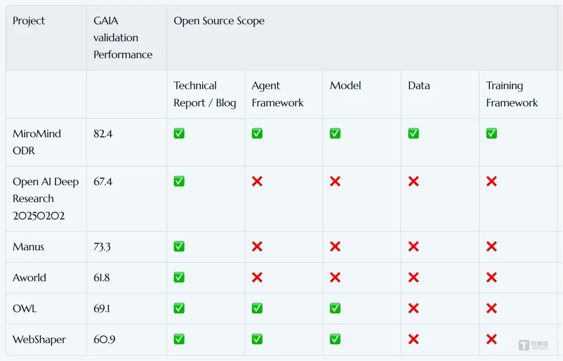 具體來說,根據MiroMind技術報告,與現有的深度研究方法相比,MiroMind ODR項目開放了深度研究的各個階段,主要包括MiroFlow、MiroThinker、MiroVerse和MiroTrain四個子項目,而且可以在手機端上運行: