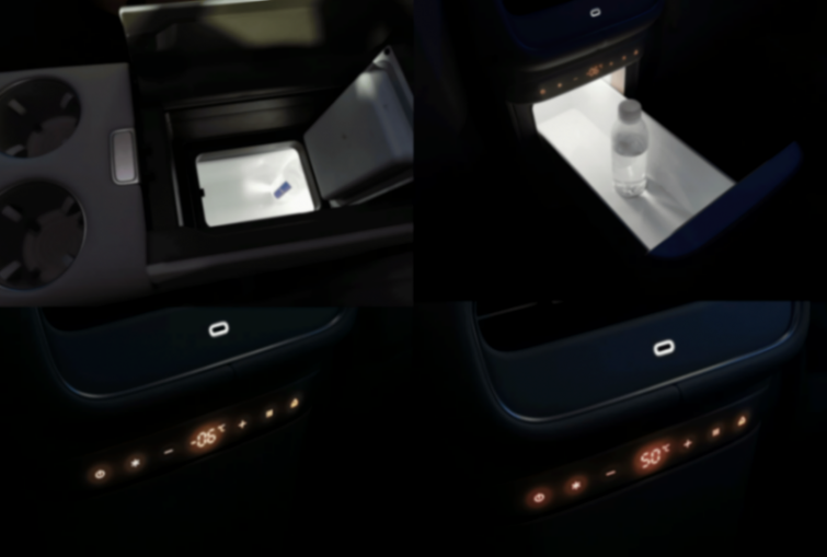 扶手區的冰箱設計可以被好評。除了有11L的容積、-6℃—50℃的溫控范圍外,它還有“雙開門”設計,可以從扶手箱打開,也可以從面彈開,分別方便前排和后排的乘客。不過,不可以同時開這兩個“門”,大家可以想想為什么。