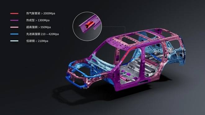 猛士M817的車身采用了高壓一體成型縱梁+關鍵環狀結構上車體設計+專業非承載式四縱十橫下車體設計+封閉框架式橫縱梁結構車架設計,1500MPa一體式熱成型門環、1500MPa A柱內板、2000MPa A柱內嵌熱氣脹管梁、2000MPa雙車門防撞板、9孔門檻加強梁以及全車頂壓安全設計,實現車身上下左右的無死角防護。