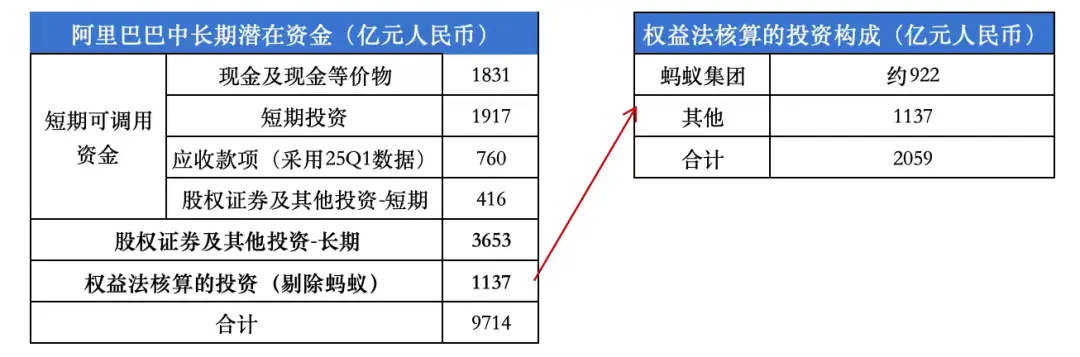 第二個層次對應資金約9714億元:截至2025上半年,阿里巴巴長期股權證券及其他投資3653億元,權益法核算的投資約1137億元(剔除螞蟻),長期投資合計4790億元,公司在長周期可動用的最大資金量9714億元,近萬億元。