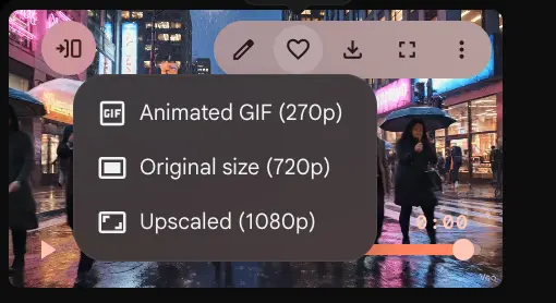 Veo 3.1 FAST 模式默認生成的是 720p,但下載的時候可以提升到 1080p(如上圖),可以想象,肯定是要付費的。
